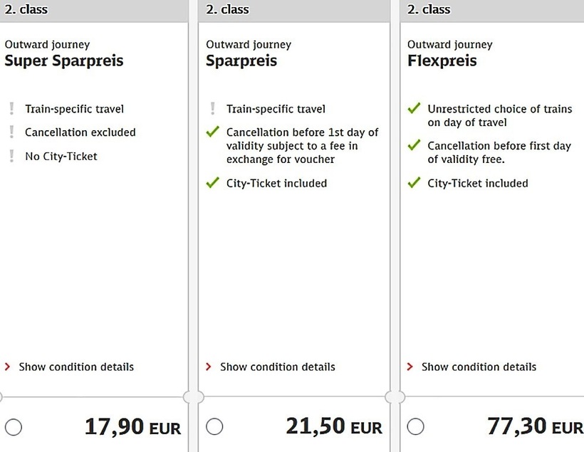 Билеты (для вагонов любого класса) на немецкие поезда имеют 3 тарифа: