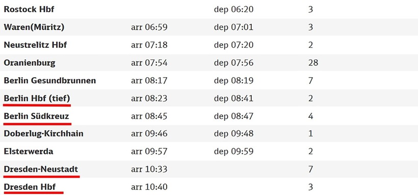 Остальные скорые составы идут дольше, но с незначительной разницей. Скажем, № 2171 Берлин — Дрезден едет 2 часа 14 минут.