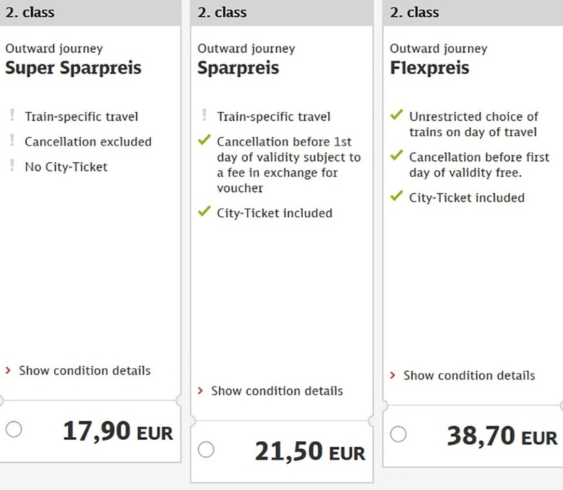 Число недорогих билетов ограниченно, поэтому разумнее приобретать их пораньше. При покупке билета во 2-й класс на текущий день, его стоимость будет примерно 36 € (2500 ₽). Зато путешествие (также во 2-м классе), оплаченное за 1–2 недели перед поездкой, стоит около 18 € (1200 ₽). Но следует запомнить пару нюансов. Дешевые билеты (по тарифам Super Sparpreis или Sparpreis) дают право ехать исключительно на том поезде, чье время отбытия указано на бланке. Если вы не хотите привязываться к конкретному времени, то лучше путешествовать по тарифу Flexpreis.
