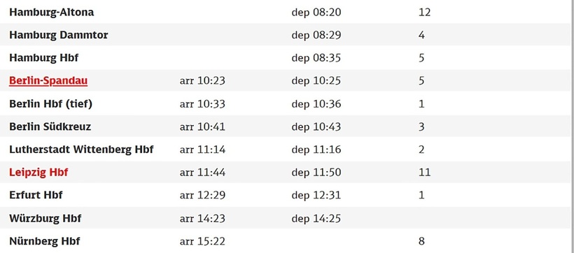 Самые быстрые составы ICE 507 и ICE 505, идущие из Гамбург — Нюрнберг. По пути они проходят Берлин, делая остановки на вокзалах: