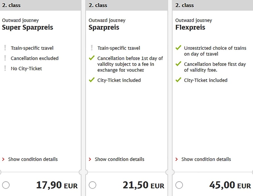 Стоимость путешествия скорыми поездами зависит от времени покупки билета, а также от времени и даты самого рейса. Скажем, вояж днем в пятницу (оплаченный за 1 сутки до поездки), будет стоить минимум 33 € (2300 ₽) для 2-го класса, и 76 € (5200 ₽) для 1-го класса. Гораздо выгоднее, приобрести билеты за 2 недели до выезда, так вы уплатите всего 18 € (1200 ₽) за проезд во 2-ом классе или 27 € (1800 ₽) — в 1-ом классе.