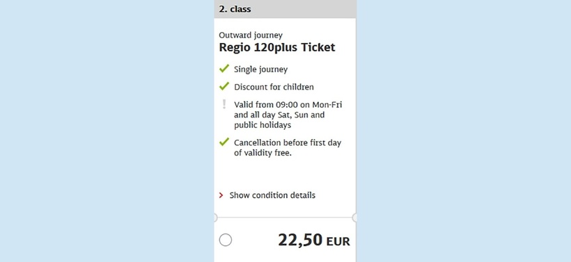 По проездному пассажир имеет право совершить 1 поездку (только на местном транспорте). Но он сам может выбрать время отъезда (в интервале с 9 утра до 3 ночи). Кроме того, билет можно вернуть за сутки до поездки (его стоимость будет полностью возвращена). Главный плюс проездного — его цена не зависит от времени покупки. Если вам нужно срочно (сегодня или завтра) ехать, то Regio 120-plus-Ticket — идеальный вариант.