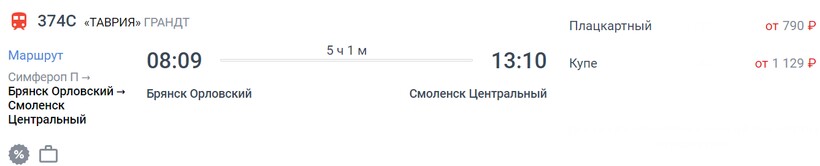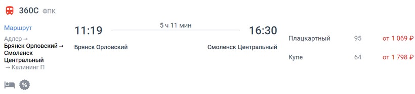На октябрь-ноябрь минимальная стоимость билета в Смоленск составляет 641 (поезд 360С, Плацкарт), а максимальная — 1625 (поезд 360С, Купе).
