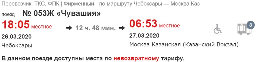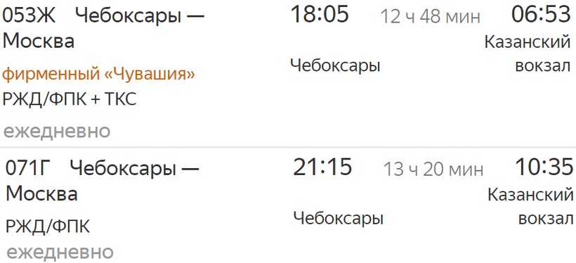 График движения у фирменного состава № 053Ж удобный: отправляется из Чебоксар в 18:05, следует в ночное время и доставит в столицу рано утром — к 06:53.