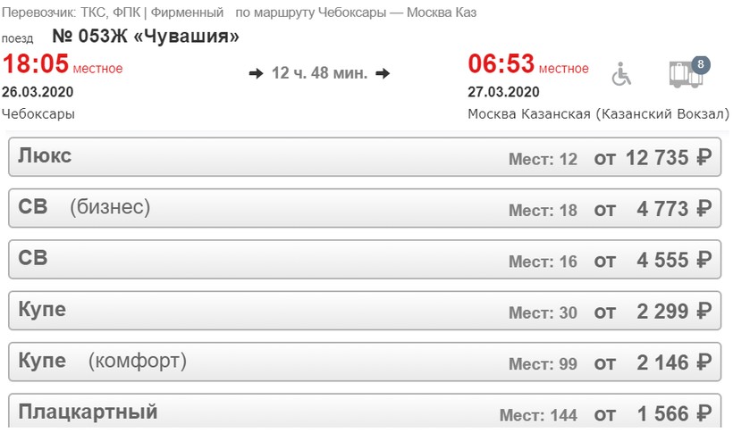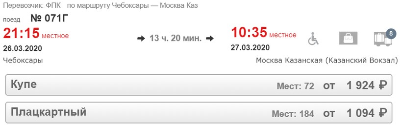 Состав № 071Г Чебоксары — Москва также скорый. И расписание у него удобное: выезжает по направлению в 21:15 (можно отправиться после завершения рабочего дня), прибытие в столицу — к 10:35. В поезде есть плацкартные и купейные вагоны, в некоторые дни цепляют сидячие и СВ. Все они оборудованы биотуалетами, кондиционерами. В стоимость проездных в купе и СВ включено постельное белье.