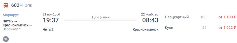 На октябрь-ноябрь минимальная стоимость билета в Краснокаменск составляет 828 (поезд 602Ч, Плацкарт), а максимальная — 2284 (поезд 602Ч, Купе).