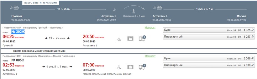 Если прямого поезда нет, а ехать в столицу нужно, то советую неплохой вариант с пересадкой в городе Астрахань. Поездка получится где-то на треть дороже и на несколько часов дольше. Сначала в 06:25 нужно сесть на пассажирский состав № 302Ж. Придется рано вставать, но адекватных альтернативных вариантов нет. До станции Астрахань-1 ехать 13 ч. 25 мин., прибытие — 20:50. Поезд весьма комфортабельный, биотуалеты, кондиционеры исправные. Питание не предусмотрено, о нем советую позаботиться до посадки. Обслуживание качественное, проводники вежливо общаются, не грубят. На пересадке придется ждать 6 часов 3 минуты (вокзал менять не нужно). До Москвы едет № 085С, отправление — 02:53, прибытие на Павелецкий вокзал — 07:00. Время в пути — 1 сут. 5 ч. 7 мин. Сервис нормальный, предлагается дополнительное питание, работают кондиционеры (летом комфортно, зимой хорошо топят). Туалеты не везде био, есть вагоны с обычными. Отношение персонала неоднозначное, в некоторых вагонах убрано, чисто и приятно пахнет, в остальных грязно и доносится неприятный запах из санузла.