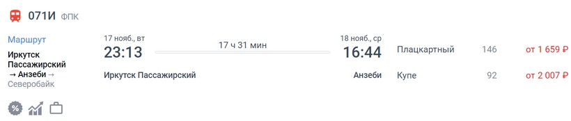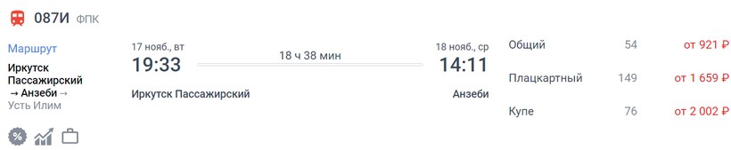 На ноябрь-декабрь минимальная стоимость билета в Братск составляет 1140 (поезд 087И, Общий), а максимальная — 5907 (поезд 071И, Купе).