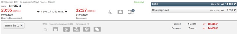 В зависимости от месяца, минимальная стоимость билета на поезд Иркутск (Россия) — Кисловодск (Россия) колеблется от 4458 (ноябрь, поезд 057И) до 9 592 рубля (август), а в среднем купить билет можно за 5546 — 7 105 рублей.