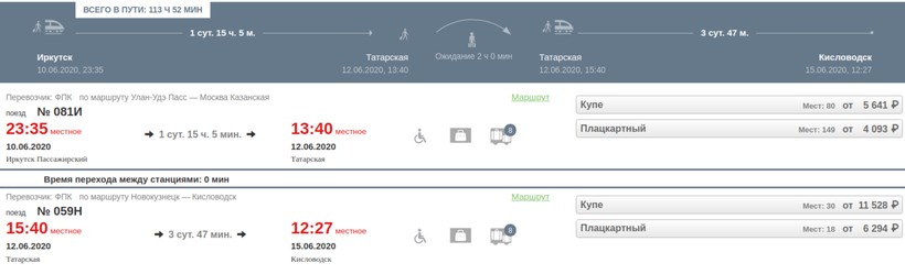 В качестве альтернативы можно рассмотреть вариант с пересадкой. Ехать можно через станцию Татарская. Выезд из Иркутска на поезде № 081И в 23:35, прибытие через 1 день 15 часов 5 минут (в 13:35). В некоторые дни график может быть другим, проверяйте актуальность перед поездкой. Состав курсирует через день. Далее предстоит пересадка продолжительностью 2 часа с лишним. Переходить никуда не нужно. В случае необходимости вещи можно сдать в багажное отделение на вокзале. Выезд из Татарской в 15:40 на поезде № 059Н, прибытие в Кисловодск через 3 дня 47 минут, в 12:27 (в некоторые дни расписание другое). Состав курсирует только 1–2 раза в неделю. Через день по такому же графику ходит № 097Э.