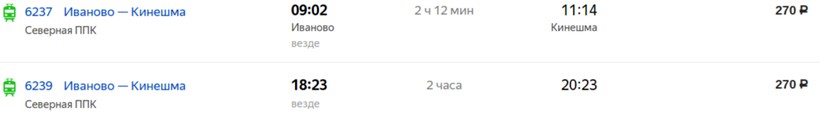 Между городами насчитывается всего 150 км. Такую небольшую дистанцию проехать на поезде можно за 2 часа. Вариантов беспересадочного проезда всего три — по маршруту курсирует две пригородные электрички и пассажирский поезд. Уехать можно в любой день. Отправляются прямые составы с ж/д станции Иваново, прибывают — на вокзал Кинешма.