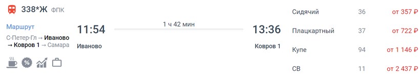 На октябрь-ноябрь минимальная стоимость билета в Ковров составляет 363 (поезд 348*Ж, Сидячий), а максимальная — 806 (поезд 338*Ж, Купе).