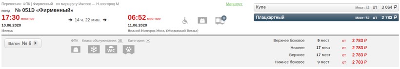 Расстояние между Ижевском и Нижним Новгородом составляет почти 800 км. На поезде, по моему опыту, ехать придется 15–16 часов. Что касается вариантов, то всего 3 состава курсируют на маршруте. Среди них: