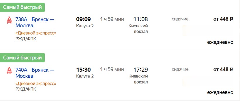 По моему опыту, добраться из Калуги до Москвы можно в среднем за 2 часа 30 минут. Расстояние между городами — приблизительно 182 км. По маршруту курсирует около 14 поездов, среди них имеются такие варианты: