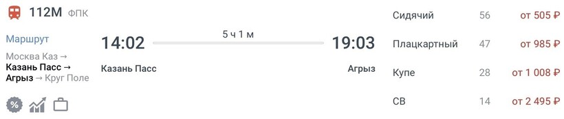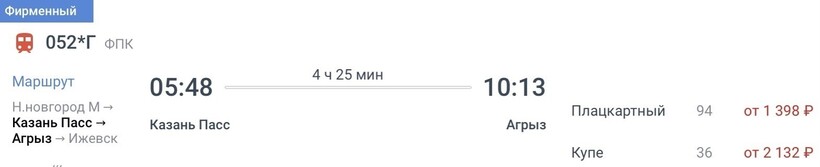 Актуальные цены и расписание поезда Казань — Агрыз, стоимость и информация о наличии билетов на скорые, пассажирские и скорые фирменные поезда АО «ФПК».