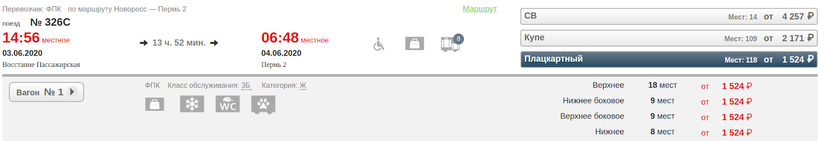 На ноябрь-декабрь минимальная стоимость билета в Пермь составляет 908 (поезд 326С, Плацкарт), а максимальная — 9019 (поезд 326С, Люкс).