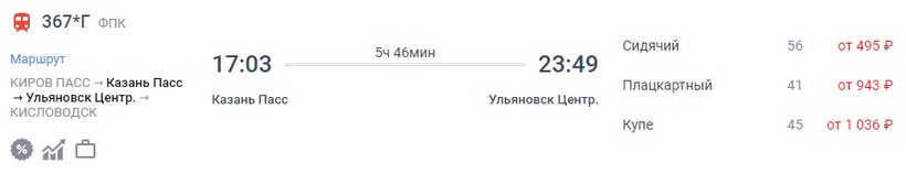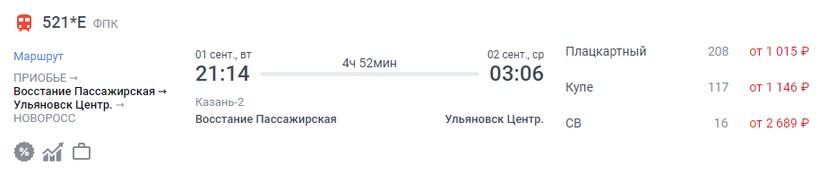 На октябрь-ноябрь минимальная стоимость билета в Ульяновск составляет 442 (поезд 367*Г, Сидячий), а максимальная — 3879 (поезд 045Е Урал, Люкс).