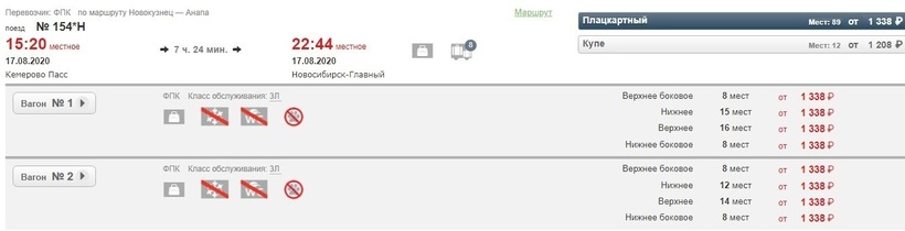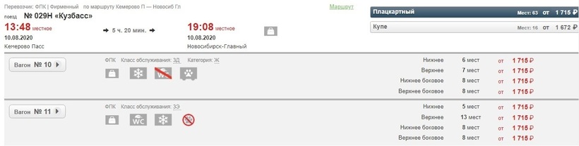 На октябрь-ноябрь минимальная стоимость билета в Новосибирск составляет 1029 (поезд 029Н Кузбасс, Плацкарт), а максимальная — 17198 (поезд , ).