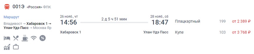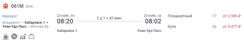На ноябрь-декабрь минимальная стоимость билета в Улан-Удэ составляет 2695 (поезд 011Й, Плацкарт), а максимальная — 29643 (поезд 061М, Люкс).