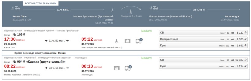 Если напрямую добраться не получится, советую ехать через Москву. Отправление из Кирова на поезде № 109М (в 17:30), прибытие в столицу через 11 часов 52 минуты — в 05:22. Состав курсирует ежедневно, за исключением июня (через день). Есть плацкартные, купейные вагоны, СВ. Почти повсюду установлены вакуумные туалеты, кондиционеры. Питание не предусмотрено. В купе есть места для людей с инвалидностью. Пересадка занимает 3 часа. Нужно перейти на другой вокзал. Поезд из Кирова прибывает на Ярославский, выезжать в Кисловодск придется с Казанского. Ориентировочное время перехода между станциями — 15 минут. Отправление из Москвы на фирменном составе № 004М «Кавказ (двухэтажный)» (в 08:22), прибытие в Кисловодск через сутки — в 08:13. Поезд ходит по четным датам, за исключением первых чисел некоторых месяцев. Есть купейные, спальные вагоны. Уровень сервиса высокий — в стоимость билета входит питание, дорожный набор, постельное белье, пресса. Есть интернет, розетки, телевизор, мультимедийные порталы.