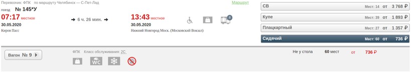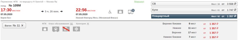 Курсирует поезд только по четным датам, исключение — середина мая (рейсов нет). Выезд в 07:17, приезд в 13:43. Коротко о сервисе: