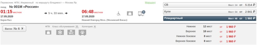 Фирменные поезда являются участниками программы динамического ценообразования, это позволяет пассажирам сэкономить на проезде. Советую не тянуть с покупкой билетов. Приведу примеры цен на проездные документы на состав № 001М «Россия» за 2,5 недели до выезда: