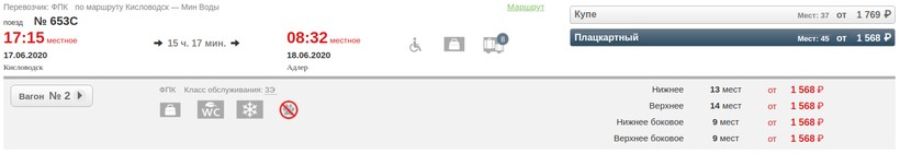 На октябрь-ноябрь минимальная стоимость билета в Адлер составляет 906 (поезд 653С, Плацкарт), а максимальная — 8239 (поезд 643С Пассажирский, Люкс).