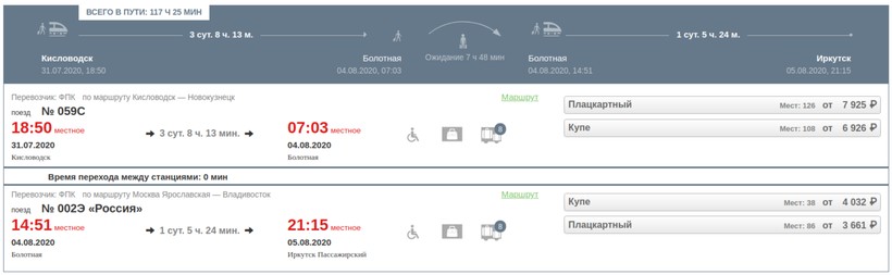 Выбирать вариант с пересадкой советую в крайних случаях. Это не так удобно, ведь придется ждать следующий рейс не один час, переносить вещи. По деньгам выходит дороже, по времени — дольше. Добраться до Иркутска можно, сделав пересадку на станции Болотная. Отправление из Кисловодска на поезде № 059С (в 18:50), прибытие на Болотную через 3 дня 8 часов 13 минут — в 07:03. Состав курсирует через день. Поезд новый, попадаются старые вагоны с обычными санузлами и без кондиционеров. Персонал вежливый, предоставляют хороший сервис. Есть услуга питания, в некоторых вагонах есть доступ к мультимедийному порталу, свежей прессе, можно получить дорожный набор. В путешествие при наличии перевозочного документа можно брать домашнее животное.