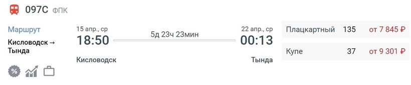 В зависимости от месяца, минимальная стоимость билета на поезд Кисловодск (Россия) — Тында (Россия) колеблется от 5255 (ноябрь, поезд 097С) до 11 111 рублей (июль), а в среднем купить билет можно за 6326 — 7 281 рубль.