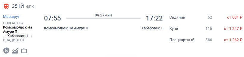 Актуальные цены и расписание поезда Комсомольск-на-Амуре — Хабаровск, стоимость и информация о наличии билетов на пассажирские и пассажирские фирменные поезда АО «ФПК».