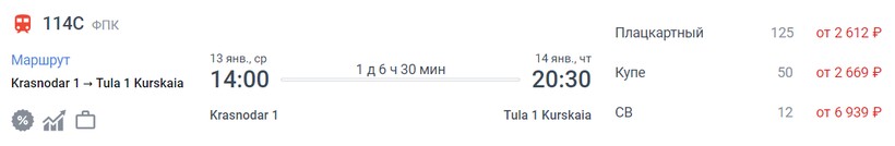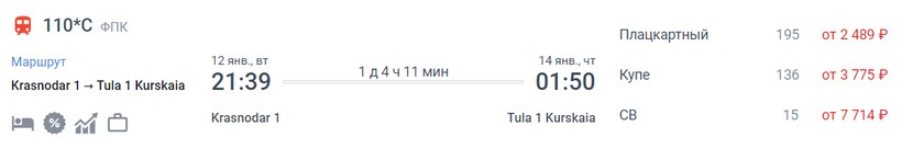На октябрь-ноябрь минимальная стоимость билета в Тулу составляет 1667 (поезд 110*С, Плацкарт), а максимальная — 12523 (поезд 084Э, Люкс).