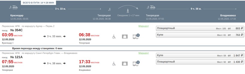 В качестве альтернативы предлагаю рассмотреть путешествие через станцию Тихорецкая. Поскольку ждать следующий поезд придется недолго, это один из самых удобных по времени вариантов с пересадкой. Выезд на поезде № 354С из Краснодара в 03:05, прибытие на станцию Тихорецкая в 06:38. Состав курсирует ежедневно с июня по начало сентября, далее — через день. Пересадка продлится 1 час 17 минут. С Тихорецкой идет поезд № 121А — в 07:55, прибытие в 17:33. Состав ходит ежедневно с апреля по июнь, далее — 4–6 раз в неделю. Около 14,5 часа займет все путешествие. Что касается сервиса, то он на достойном уровне в обоих поездах. В частности, функционируют биотуалеты, летом работают кондиционеры. В отдельных вагонах пассажирам даже выдают дорожные наборы, прессу. Также разрешено перевозить домашних животных.