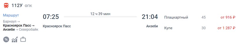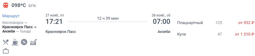 На ноябрь-декабрь минимальная стоимость билета в Братск составляет 996 (поезд 348Ы, Плацкарт), а максимальная — 5583 (поезд 348Н, Купе).