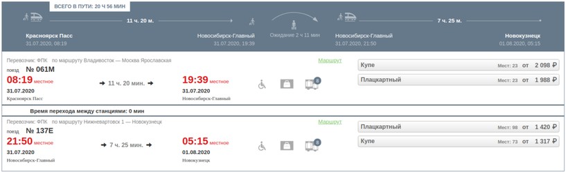 Путешествие транзитом не столь удобное, как на прямом поезде. Придется ждать следующий рейс, переносить вещи. Выбирайте такой вариант проезда в крайних случаях. Удобно по времени путешествовать через Новосибирск. Отправление из Красноярска на поезде № 061М (в 08:19), прибытие в Новосибирск через 11 часов 20 минут — в 19:39. Состав курсирует 2 раза в неделю до середины сентября (по понедельникам, пятницам), далее 4 раза — дополнительно по вторникам, четвергам. По такому графику по средам ходит № 061Щ. Сервис достойный. Вагоны новые, есть много удобств — биотуалеты, кондиционеры, розетки, кулеры с водой. Внутри чистота и порядок. Предусмотрены 2 категории вагонов — плацкартные, купейные.