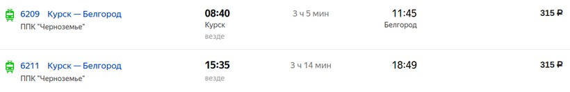 № 6209. Отправление в 08:40, прибытие через 3 часа 5 минут — в 11:45. Подойдет тем, кто планирует добраться до Белгорода как можно раньше.