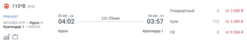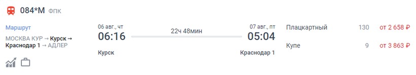 На октябрь-ноябрь минимальная стоимость билета в Краснодар составляет 1398 (поезд 110*В, Плацкарт), а максимальная — 9461 (поезд 110*В, Люкс).