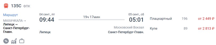 На ноябрь-декабрь минимальная стоимость билета в Санкт-Петербург составляет 1548 (поезд 049Ч, Плацкарт), а максимальная — 16823 (поезд 135С, Люкс).