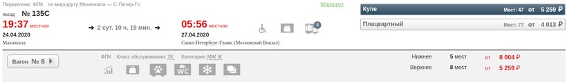 В зависимости от месяца, минимальная стоимость билета на поезд Махачкала (Россия) — Санкт-Петербург (Россия) колеблется от 2747 (ноябрь, поезд 135С) до 5 883 рубля (май), а в среднем купить билет можно за 3373 — 3 445 рублей.
