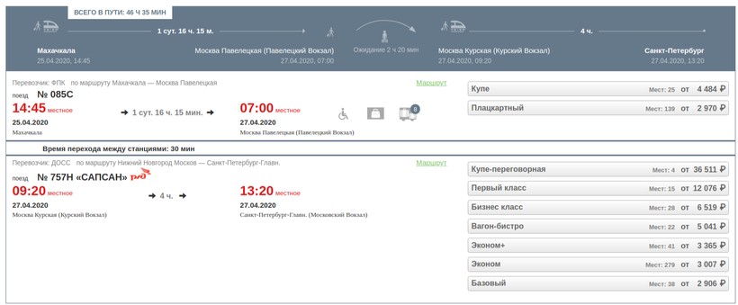 Из Махачкалы в Москву ежедневно ходит поезд № 085С. Отправка в 14:45, прибытие на Павелецкий вокзал столицы в 07:00. Время пересадки — 2 часа 20 минут. За это время можно отдохнуть и перейти на другой вокзал — Курский, выезд будет оттуда. Из Москвы в Санкт-Петербург ежедневно отправляется не один десяток составов. В данном случае лучше ехать на скоростном поезде «Сапсан» № 757Н, он отправляется в 09:20, прибывает в 13:20.
