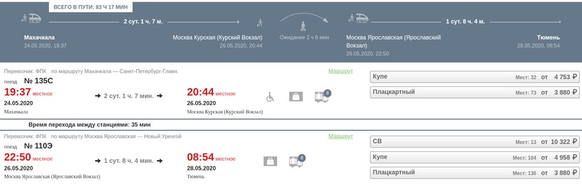 Учитывая тот факт, что поезд не всегда курсирует регулярно, актуальность приобретает вариант проезда с пересадкой. Удобнее по времени ехать через Москву. Из Махачкалы в столицу выехать можно на поезде № 135С (курсирует по четным датам) в 19:37, прибытие на Курский вокзал в 20:44 (через 2 дня 1 час 7 минут). Из своего опыта скажу, что к выходу лучше подготовиться заранее, в Москве стоянка состава составляет 37 минут. Дальше вас будет ждать пересадка, она займет чуть больше 2 часов. За это время нужно перейти на другой вокзал — Ярославский, оттуда будет происходить выезд в Тюмень. Поездка на поезде № 135С комфортная: вагоны современные, чистые, работают кондиционеры, можно пользоваться биотуалетами, там есть все необходимые средства гигиены.