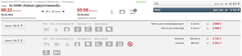 Фирменный поезд № 004М «Кавказ (двухэтажный)» — участник программы РЖД «Динамическое ценообразование». Это дает возможность купить билеты по низкой цене, но только при условии, что оформлены они будут заранее. Приведу пример стоимости за 1,5 месяца до выезда: