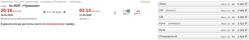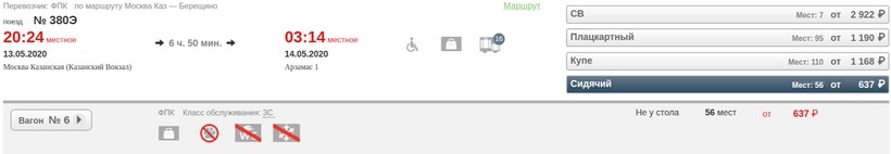 На октябрь-ноябрь минимальная стоимость билета в Арзамас составляет 572 (поезд 380Э, Сидячий), а максимальная — 14272 (поезд 054Г Чувашия, Мягкий).