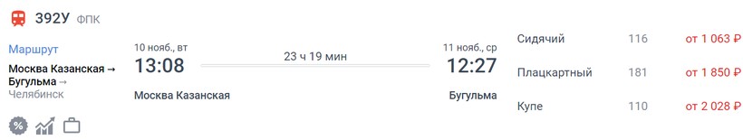 На октябрь-ноябрь минимальная стоимость билета в Бугульму составляет 1221 (поезд 392У, Сидячий), а максимальная — 4675 (поезд 116Й, Купе).