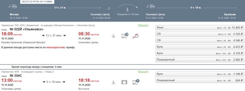 Цены на билеты за месяц до выезда. На фирменный состав № 022Й «Ульяновск»: