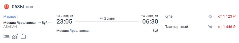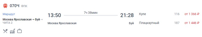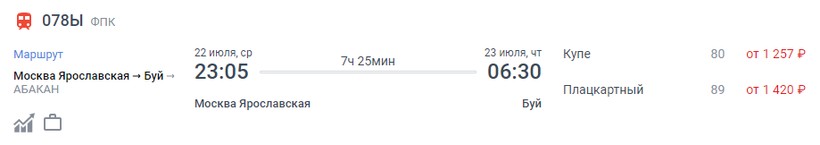 На октябрь-ноябрь минимальная стоимость билета в Буй составляет 793 (поезд 078Ы, Плацкарт), а максимальная — 1788 (поезд 070Ч Москва – Чита, Купе).