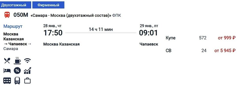 На состав распространяется система динамического ценообразования. Рекомендую оплачивать проезд хотя бы за месяц до отбытия, за этот период времени билеты на поезд № 050М «Москва — Самара (двухэтажный)» стоят 999 ₽ (купе) и 6500 ₽ (СВ).