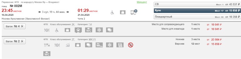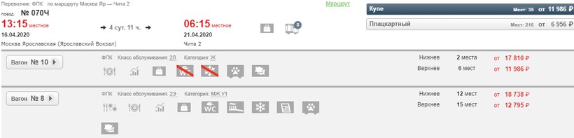 В зависимости от месяца, минимальная стоимость билета на поезд Москва (Россия) — Чита (Россия) колеблется от 4667 (ноябрь, поезд 002Э Россия) до 9 890 рублей (август), а в среднем купить билет можно за 5601 — 5 808 рублей.