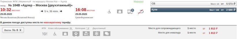 Фирменный состав № 740Ж «Москва — Воронеж (двухэтажный)» курсирует ежедневно при наличии достаточного пассажиропотока (если спроса нет, поезд могут отменить). Отбытие в 08:14, прибытие через 5 часов 8 минут — в 13:22. В поезде предусмотрены вагоны с сидячими местами и купе. Температура внутри комфортная (работают кондиционеры), есть биотуалеты. Если вы хотите сэкономить на проезде, тогда советую выбирать вагон с сидячими местами, за билет в среднем придется заплатить от 584 рублей. Кресла там удобные, можно регулировать спинку. Доступны розетки, есть интернет.