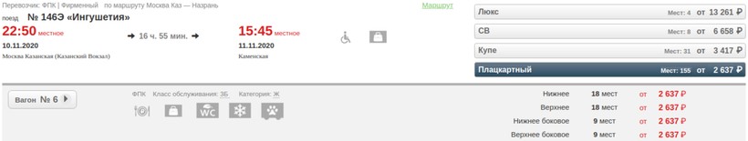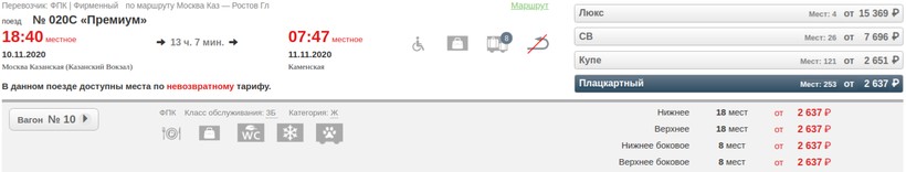 На октябрь-ноябрь минимальная стоимость билета в Каменск-Шахтинский составляет 1021 (поезд , ), а максимальная — 25606 (поезд 020С Тихий Дон, Мягкий).