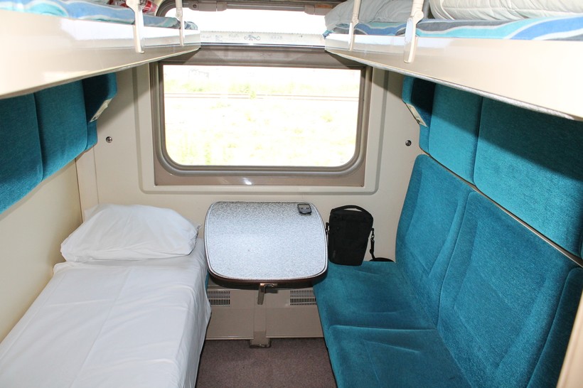 В купе 4 полки, столик, кондиционер (работает в летний период), мультимедийный портал «Попутчик», розетки для зарядки гаджетов. Всем пассажирам предоставляется пресса, гигиенический набор и постельное белье. Из минусов: Wi-Fi работает со сбоями, места для багажа мало. Туалеты расположены в одном конце вагона, их три, мусорки там же.